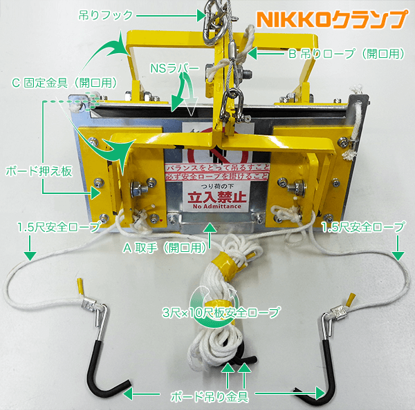 (例:1枚26㎏の1.5尺用板でも2枚まで) - クランプの各部品やワイヤーに摩耗・変形・破損などの異常がある時は使用せずただちに交換してください。